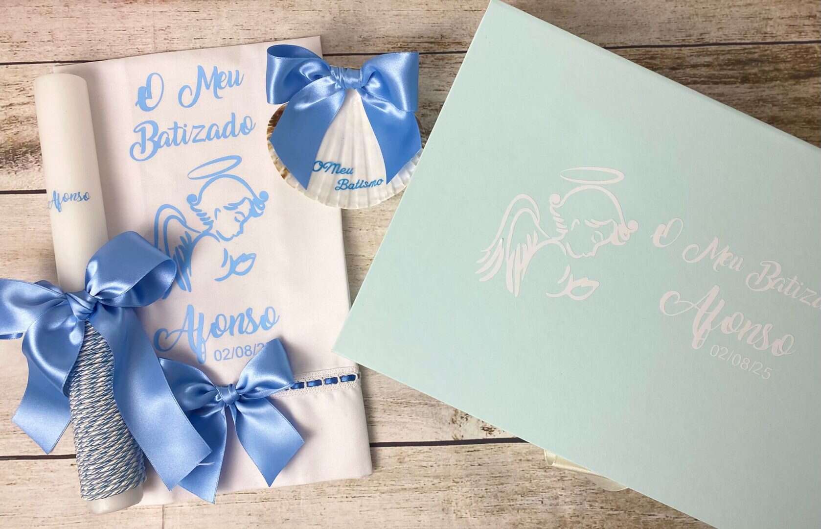 Caixa de batismo Rafael, conjunto vela toalha e concha | Batizado