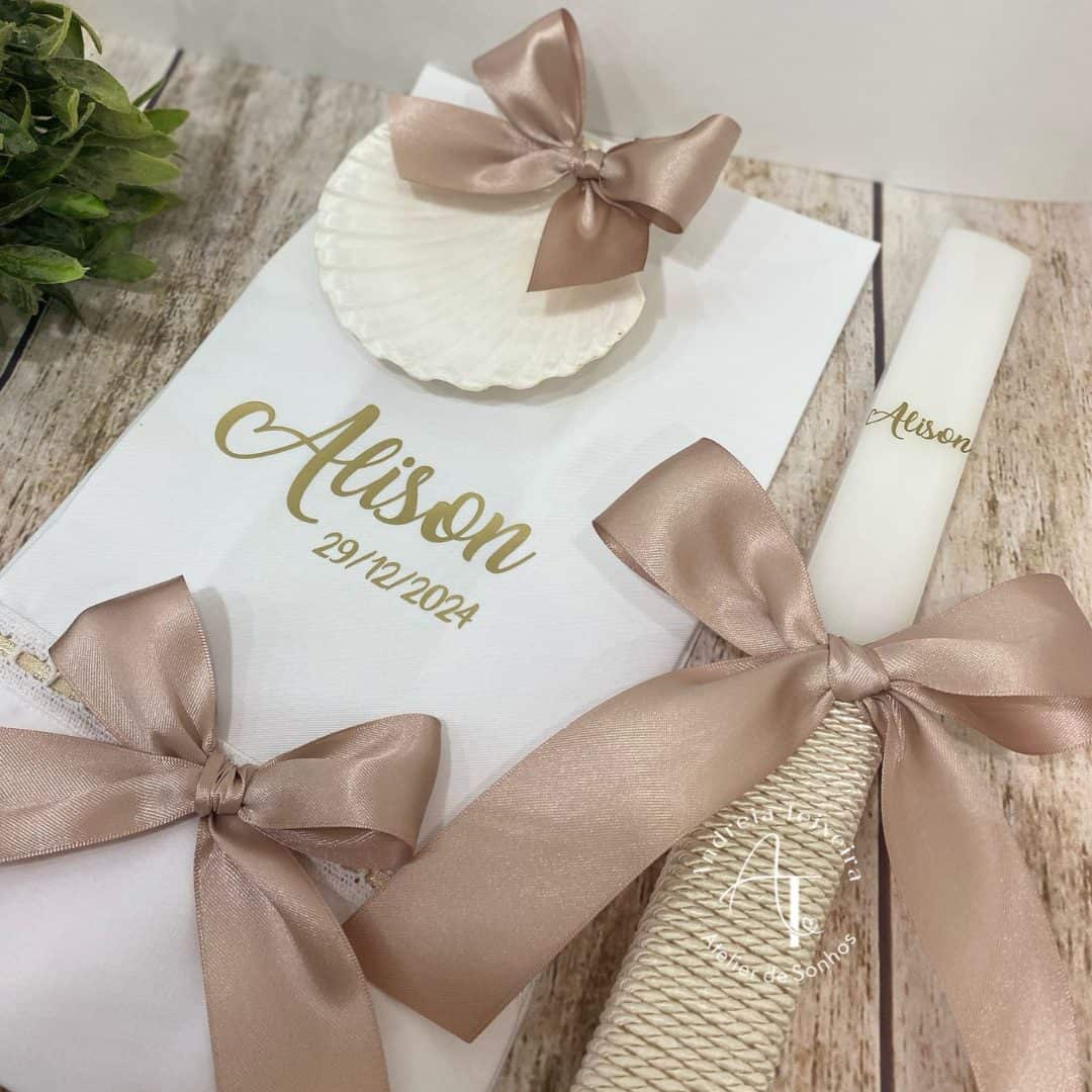 Conjunto de batismo em tons bege e nude com vela, toalha e concha personalizadas. Um detalhe elegante para um dia cheio de significado.