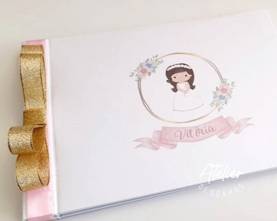 Com capa ilustrada em tons suaves, fita de cetim rosa e nome e data personalizáveis, é uma peça encantadora para eternizar este momento tão especial.
