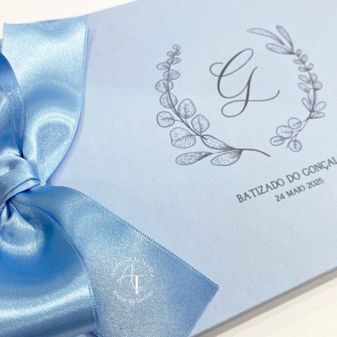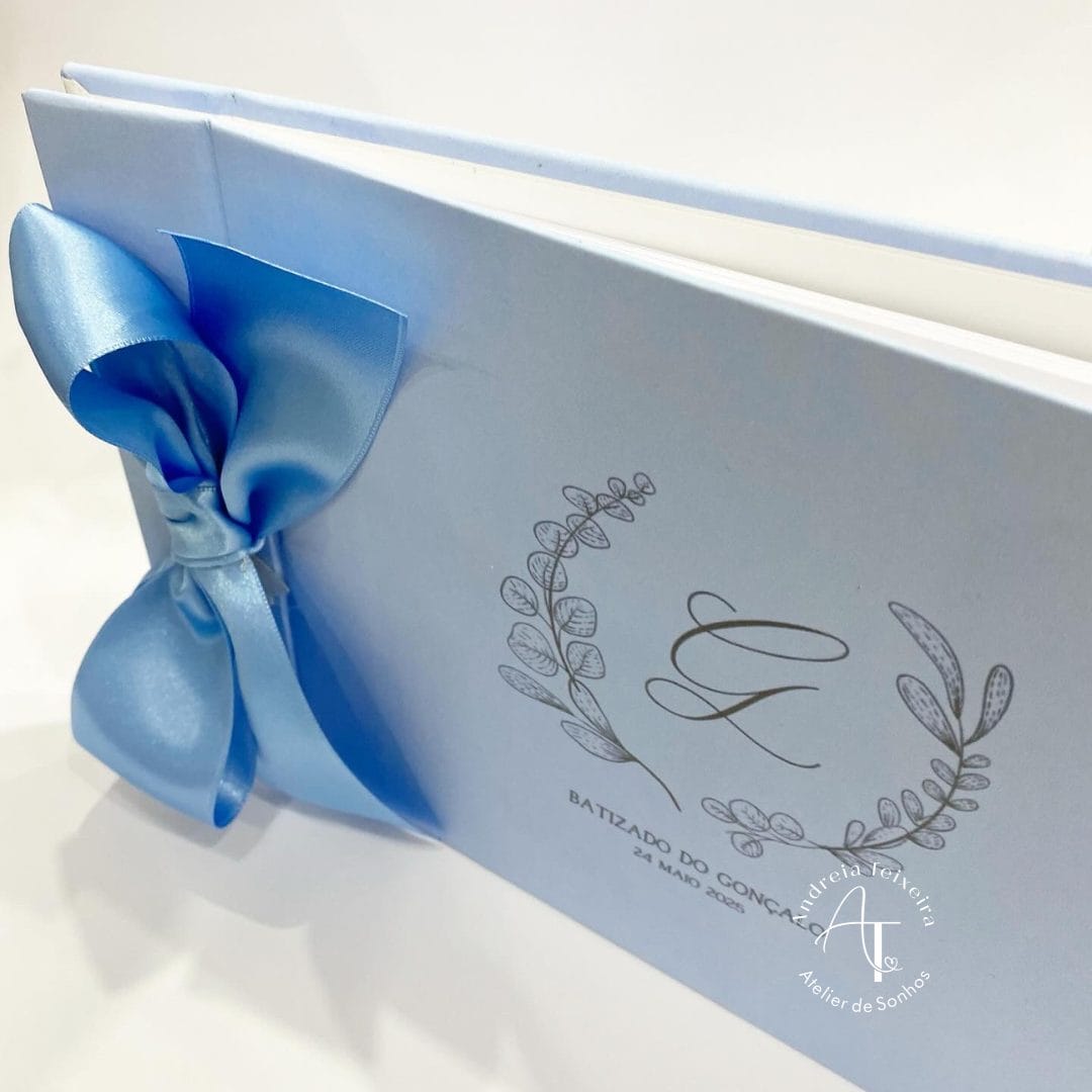Personalizado com o nome e a data, este livro tem capa azul, ilustração delicada com folhagem e um laço em cetim, tornando-o perfeito para guardar mensagens, desenhos e recordações dos convidados.