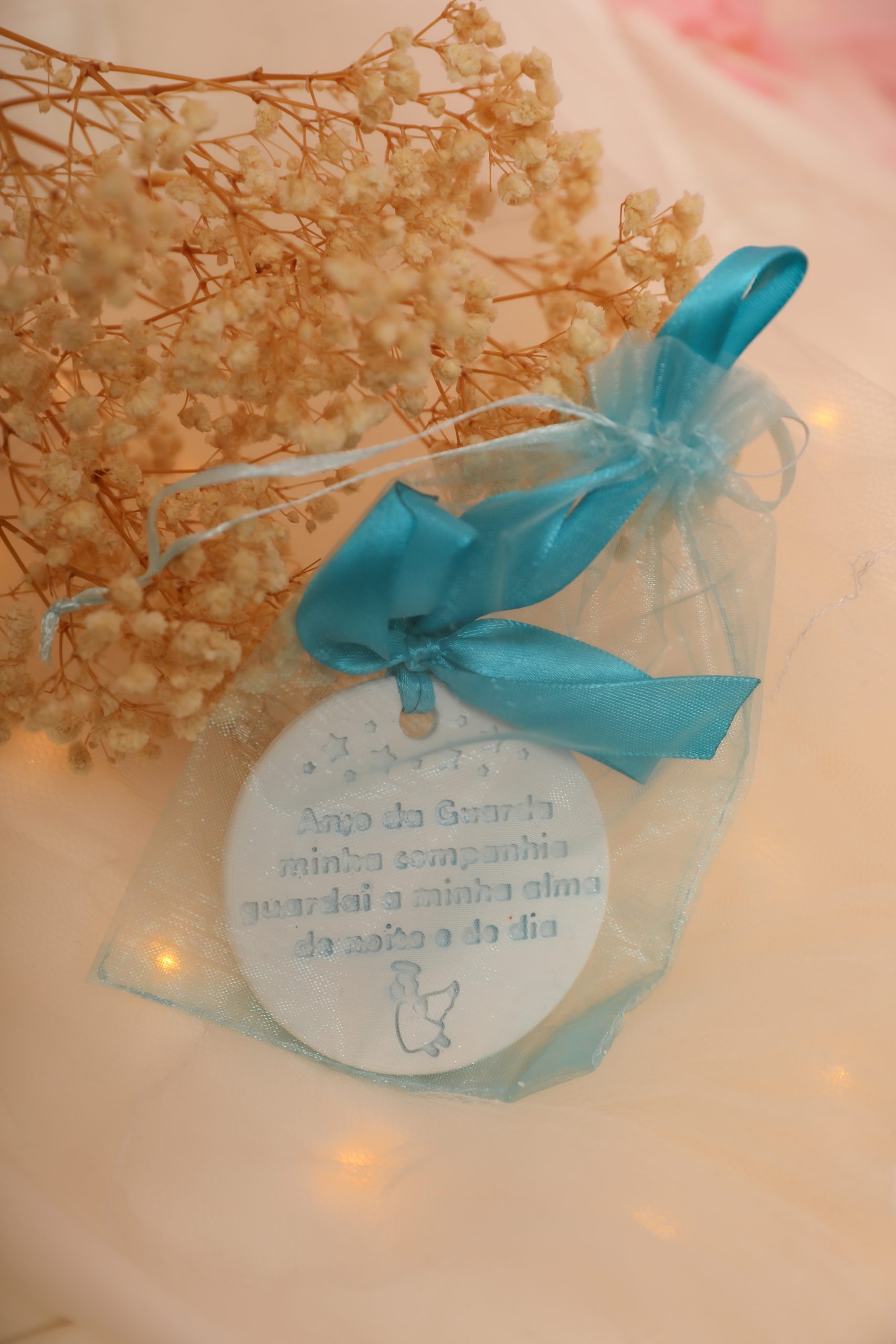 A medalha com oração em gesso perfumado é uma lembrança de batizado delicada, simbólica e útil, perfeita para oferecer aos convidados.