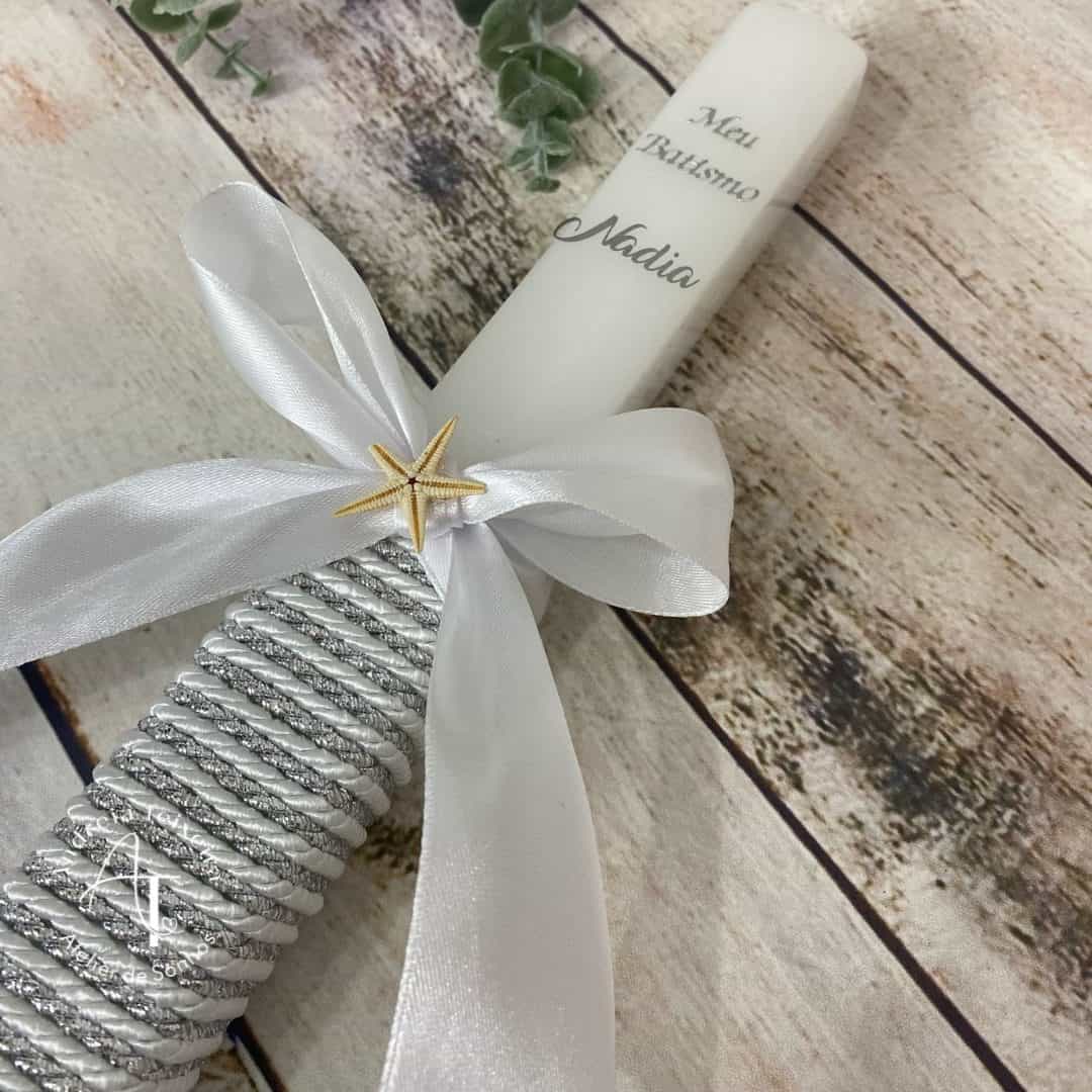 Vela quadrada com cordão cinza prata e branco, laço branco com aplique de estrela do mar (pode escolher outra opção)