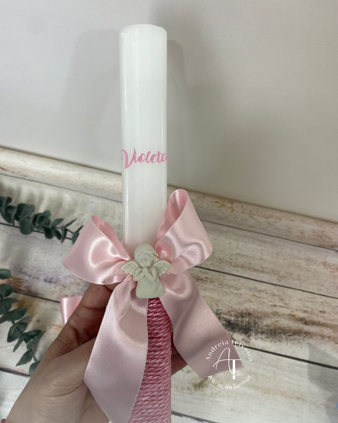 O corpo da vela, num branco acetinado, serve de base para a personalização do nome, realizada com um traço caligráfico elegante que eleva a sofisticação da peça. A base da vela é inteiramente revestida por um cordão rosa de textura rica, aplicado de forma minuciosa para garantir uma aderência segura e um aspeto artesanal luxuoso. Sobre este revestimento, repousa um laço generoso em cetim rosa, cujo brilho suave enquadra o elemento central: um aplique de anjo em pose de oração. Este detalhe tridimensional confere à vela uma profundidade e um simbolismo que a distinguem das peças comuns.