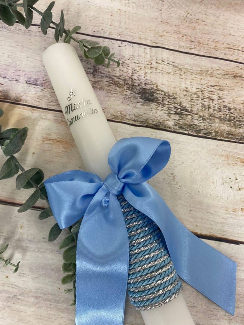 Vela redonda com acabamento delicado em azul e prateado, ideal para tornar a sua comunhão ainda mais especial.