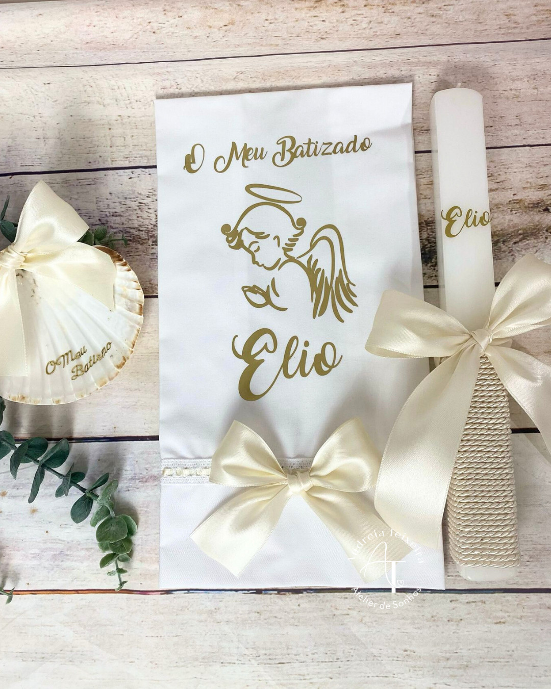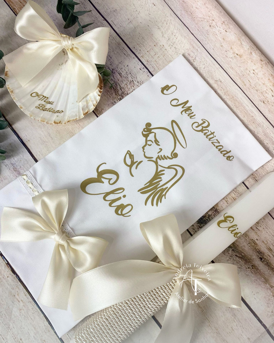 A Vela, Toalha e Concha de Batizado Essência com Anjo é a materialização da luz e da pureza, unindo três elementos fundamentais do ritual numa estética de luxo artesanal.